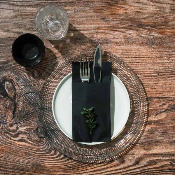 Servilletas similares a la tela, Airlaid negra de 40×40 con bolsillo delantero para cubiertos.